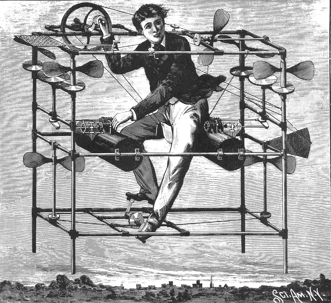 History is littered with humorous and occasionally tragic follies played out by intrepid would-be pilots. The dream of humankind has always been to be where humankind is not: above the ground, in outer space, amid the depths of the ocean, etc. The primary drawback of any attempt at a person transporting oneself through the air, Dr. Clumber points out, is the very intransitivity of the experience: one does not transport, one is transported. A flying machine is always necessary.
