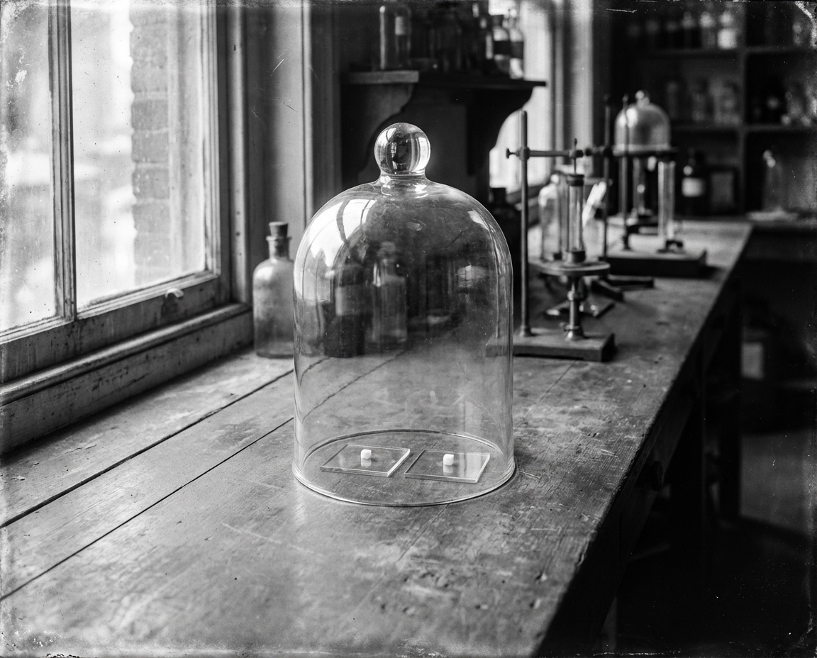 Initiated in late 1902 by Dr. Prof. Walter J. Bullock, one of the Institute’s original scienticians, the study was titled “A Modest Inquiry into the Patience of Matter.” It consisted of a sealed bell jar containing two matched salt grains on parallel glass plates. Weekly observations were originally logged by hand, then typewritten, then punch card, and finally logged digitally in the Institute’s purpose-built CMS.