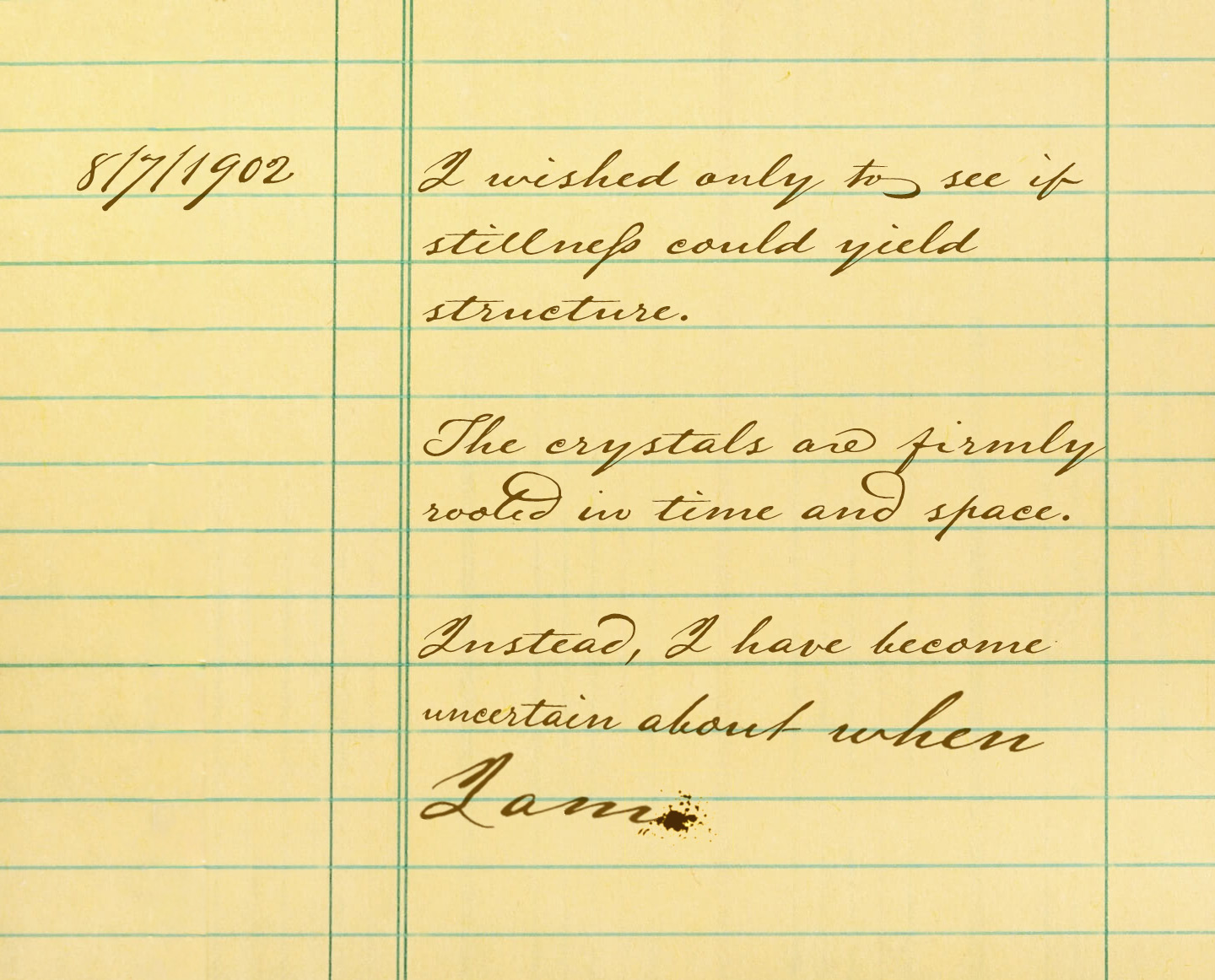 I wished only to see if stillness could yield structure. The crystals are firmly rooted in time and space. Instead, I have become uncertain about when I am.